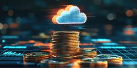 A luminous cloud icon hovers above a towering stack of gold coins, symbolizing the immense value and potential of cloud computing in today's digital landscape
