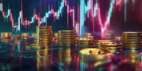 A stack of golden coins stands tall amidst a dynamic display of stock market data, symbolizing the ebb and flow of financial markets and the constant pursuit of investment opportunities