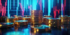 A stack of golden coins stands tall amidst a dynamic display of stock market data, symbolizing the ebb and flow of financial markets and the constant pursuit of investment opportunities
