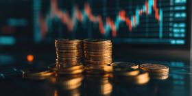 A stack of golden coins stands tall amidst a dynamic display of stock market data, symbolizing the ebb and flow of financial markets and the constant pursuit of investment opportunities