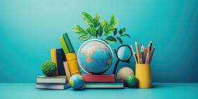 A globe, a symbol of exploration and discovery, rests atop a stack of books, surrounded by lush greenery, representing the power of education to broaden horizons and foster a deeper understanding of our planet