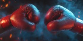 A pair of red boxing gloves face off against a backdrop of dramatic lighting and sparks, capturing the intensity and anticipation of a championship bout
