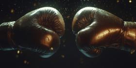 A pair of red boxing gloves face off against a backdrop of dramatic lighting and sparks, capturing the intensity and anticipation of a championship bout