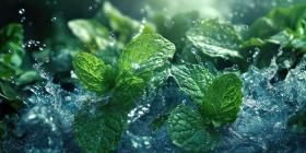 A vibrant spray of water splashes over a bed of lush mint leaves, capturing the invigorating scent and the essence of freshness