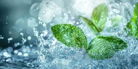 A vibrant spray of water splashes over a bed of lush mint leaves, capturing the invigorating scent and the essence of freshness