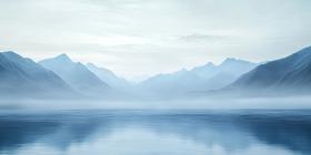 A breathtaking vista of a desolate, icy landscape, where snow-capped mountains rise majestically above a frozen lake, shrouded in a veil of mist