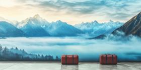 A breathtaking vista of a desolate, icy landscape, where snow-capped mountains rise majestically above a frozen lake, shrouded in a veil of mist