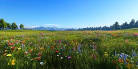 A breathtaking panorama of a vibrant meadow, ablaze with a kaleidoscope of wildflowers, stretches towards a backdrop of snow-capped mountains under a clear blue sky