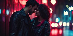 Two Individuals in Black Leather Jackets Standing Close Together in an Urban Setting at Night, Against a Backdrop of Street Lights and Figures Creating a Bokeh Effect with Warm and Cool Tones