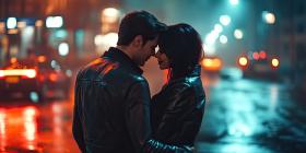 Two Individuals in Black Leather Jackets Standing Close Together in an Urban Setting at Night, Against a Backdrop of Street Lights and Figures Creating a Bokeh Effect with Warm and Cool Tones
