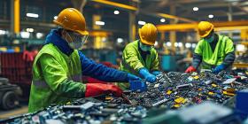 Inside a Recycling Facility: Workers Sorting through Electronic Waste on a Conveyor Belt, Wearing High-Visibility Jackets and Hard Hats, with Industrial Equipment and Machinery in the Well-Lit Background