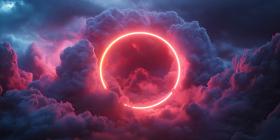 A luminous neon ring hovers amidst a dramatic sky, piercing through the clouds and beckoning the viewer towards the unknown