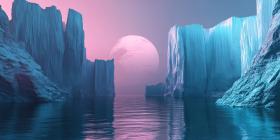 A surreal landscape unfolds, where towering icy cliffs frame a serene lake, reflecting the ethereal glow of a giant, pink moon in a dreamlike, otherworldly scene