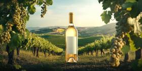 A bottle of wine stands tall amidst a picturesque vineyard, bathed in the warm glow of the setting sun, inviting you to raise a glass and savor the fruits of the vine