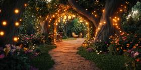 A winding path, illuminated by twinkling lights, leads through a magical garden, where flowers bloom and the air is filled with the promise of wonder