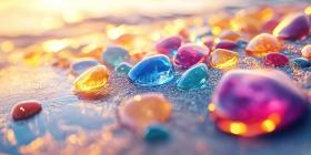 A collection of smooth, colorful pebbles bask in the warm glow of a setting sun, creating a scene of tranquility and natural beauty along the sandy shore