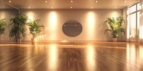 This spacious and sunlit room, adorned with lush greenery and a large circular mirror, exudes an aura of peace and serenity, inviting moments of relaxation and rejuvenation