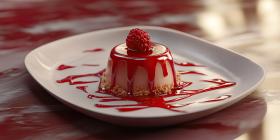 A Berry Delight: A creamy dessert, adorned with a fresh raspberry and drizzled with a vibrant red sauce, invites you to indulge in a moment of sweet satisfaction