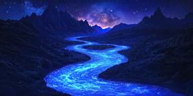 A winding river, glowing with an ethereal blue light, snakes through a mystical landscape under a sky ablaze with stars, creating a scene of otherworldly beauty