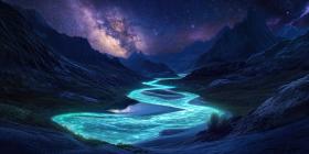 A winding river, glowing with an ethereal blue light, snakes through a mystical landscape under a sky ablaze with stars, creating a scene of otherworldly beauty