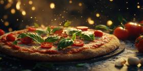 A Margherita pizza, fresh from the oven, sizzles under the warm glow of lights, inviting you to savor the classic flavors of Italy