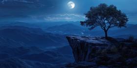 A lone tree stands sentinel on a rocky precipice, bathed in the ethereal glow of a full moon, under a sky studded with stars