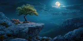 A lone tree stands sentinel on a rocky precipice, bathed in the ethereal glow of a full moon, under a sky studded with stars