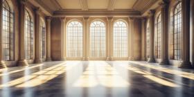 Sunlight streams through a colonnade of towering pillars, illuminating the grand hall of a palatial residence, creating an atmosphere of grandeur and timeless elegance