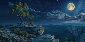 A lone tree stands sentinel on a rocky precipice, bathed in the ethereal glow of a full moon, under a sky studded with stars
