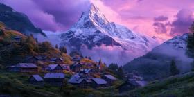 A majestic mountain peak, bathed in the vibrant hues of a breathtaking sunset, overlooks a picturesque village nestled amidst the dramatic Himalayan landscape
