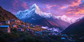 A majestic mountain peak, bathed in the vibrant hues of a breathtaking sunset, overlooks a picturesque village nestled amidst the dramatic Himalayan landscape