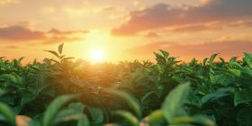 A field of lush green crops basks in the warm glow of the setting sun, creating a picturesque scene of rural tranquility