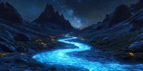 A winding river, glowing with an ethereal blue light, snakes through a mystical landscape under a sky ablaze with stars, creating a scene of otherworldly beauty
