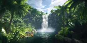A cascading waterfall plunges into a crystal-clear pool, surrounded by a lush tropical paradise, creating a scene of tranquility and natural beauty