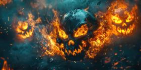 Flames engulf a desolate village under a menacing sky, as bats circle overhead, creating a scene of apocalyptic dread and impending doom