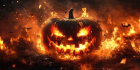 Flames engulf a desolate village under a menacing sky, as bats circle overhead, creating a scene of apocalyptic dread and impending doom