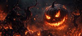 Flames engulf a desolate village under a menacing sky, as bats circle overhead, creating a scene of apocalyptic dread and impending doom