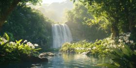 A cascading waterfall plunges into a crystal-clear pool, surrounded by a lush tropical paradise, creating a scene of tranquility and natural beauty