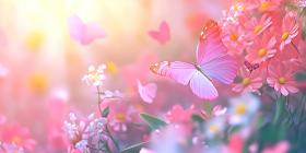 A vibrant butterfly, with wings alight, rests on a cluster of glowing pink flowers, creating a scene of ethereal beauty and magic