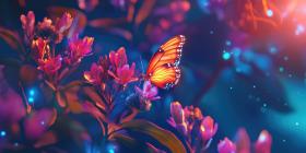 A vibrant butterfly, with wings alight, rests on a cluster of glowing pink flowers, creating a scene of ethereal beauty and magic