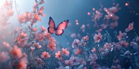 A vibrant butterfly, with wings alight, rests on a cluster of glowing pink flowers, creating a scene of ethereal beauty and magic