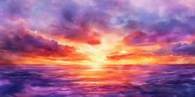 A breathtaking watercolor painting captures the vibrant hues of a sunset, painting the sky in shades of orange, purple, and red, as the sun dips below the horizon