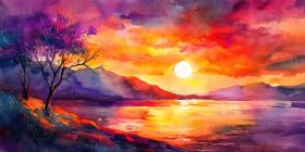A breathtaking watercolor painting captures the vibrant hues of a sunset, painting the sky in shades of orange, purple, and red, as the sun dips below the horizon