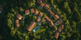 An aerial view captures a picturesque village nestled amidst rolling hills, with charming stone houses and lush greenery, evoking a sense of tranquility and idyllic Mediterranean living
