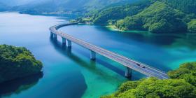 A majestic bridge spans a serene lake, its graceful arches reflecting on the calm water below, creating a picturesque scene of infrastructure and natural beauty
