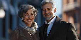 Two Individuals Walking Outdoors in Urban Setting: Late Afternoon or Early Evening with Warm, Golden Hue, Person on the Left Wearing Light-Colored Blazer Over Sweater and Shirt