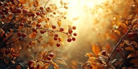 A field of vibrant red leaves bathed in the warm light of the setting sun, creating a scene of tranquility and natural beauty