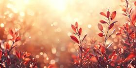 A field of vibrant red leaves bathed in the warm light of the setting sun, creating a scene of tranquility and natural beauty