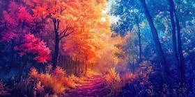 A winding path through a forest, where vibrant autumnal colors meet a cool, blue expanse, creating a surreal and captivating scene