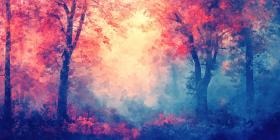 A winding path through a forest, where vibrant autumnal colors meet a cool, blue expanse, creating a surreal and captivating scene
